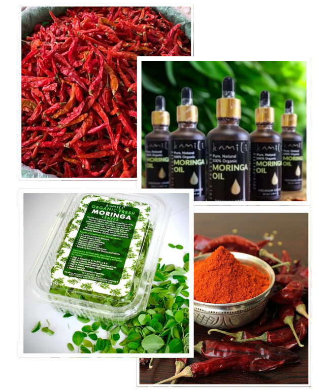 We manufacture and export Fine Moringa Powder, Dried Whole Chilies, Chili Powder, and Cold-Pressed Moringa Oil. We also import premium moringa and chili seeds and offer co-packing services to support brand growth.